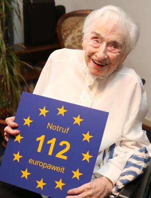Frau Edelgard Huber von Gersdorff, 112 Jahre alt, unterstützt als Ehren-Schirmherrin den europaweiten Notruf 112. Sie hat miterlebt, wie Europa sich von einem Kontinent der Kriege und Zerstörung zu einer Gemeinschaft des Helfens entwickelt hat. „Die 112 ist das Zeichen für Hilfe und ein wichtiges Symbol für die europäische Einigung“, so die Seniorin. Ein Europa – eine Nummer!