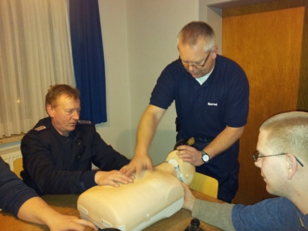 Die Aktiven haben sich in Erster Hilfe weitergebildet. Der Schwerpunkt lag dieses Mal auf den Einsatzmöglichkeiten des Notfallrucksacks (verlastet auf dem LF 16/12). Bernd Schwerdtfeger, selbst Rettungsassistent bei der Johanniter Unfallhilfe, unterwies die Anwesenden u.a. in der Handhabung des Beatmungsbeutels und der Stiffnecks.