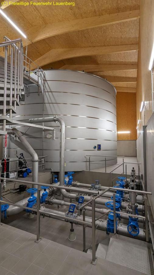 Wie diese Mengen gespeichert werden können, zeigen eindrucksvoll die beiden Behälter mit ihren jeweils 600 m³ Inhalt. Über Rohrleitungen geht das Wasser von hier aus Richtung Dassel, Markoldendorf und natürlich auch direkt nach Lauenberg.