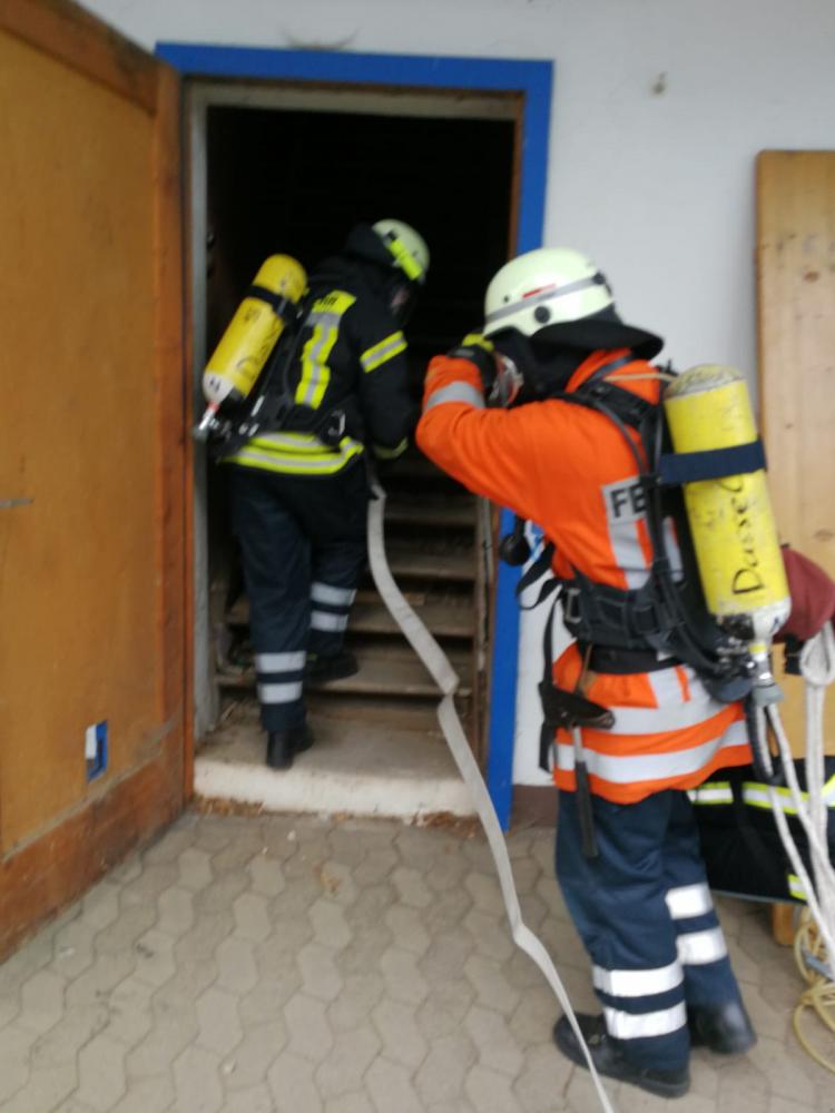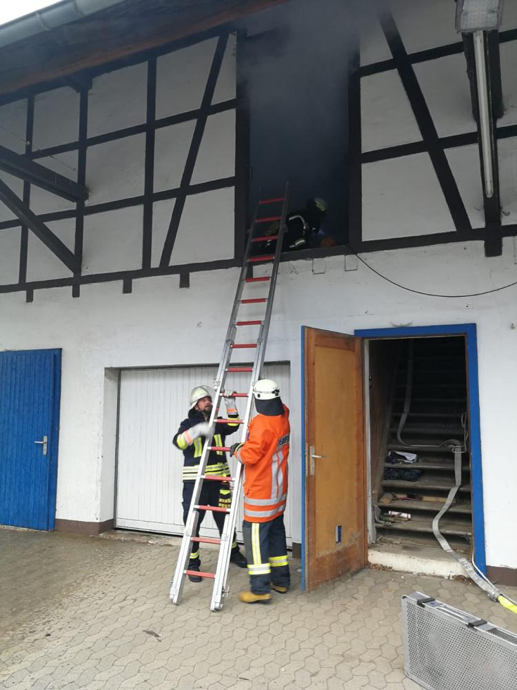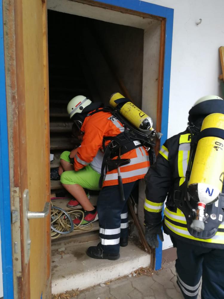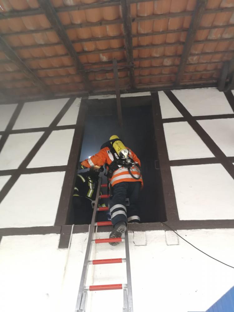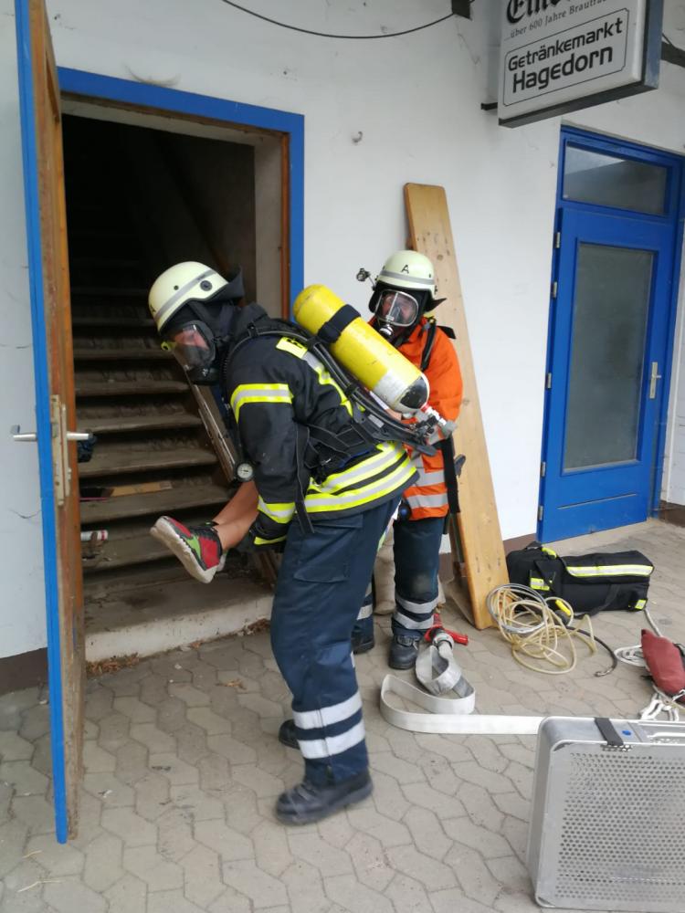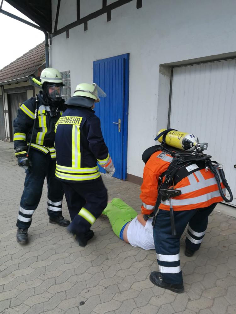 Unter schwerem Atemschutz drangen zwei Trupps in das verrauchte Obergeschoss vor und retteten die Verletztendarsteller. Ein Verletzter musste mit Hilfe der Steckleiter gerettet werden. Durch die Verrauchung wurde die Rettung extrem erschwert. Die Geretteten erhielten vor Ort eine Erstversorgung.