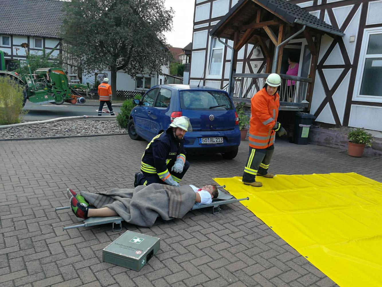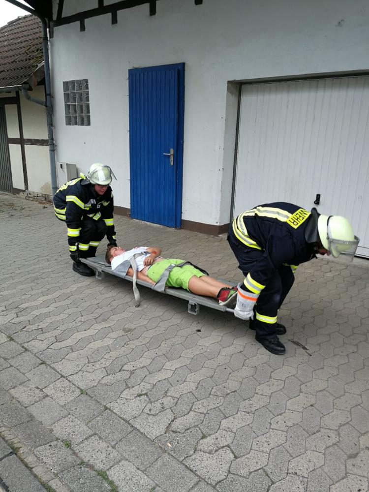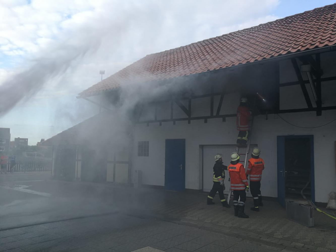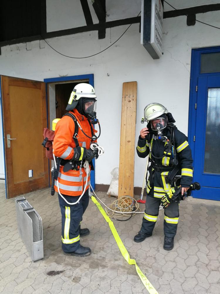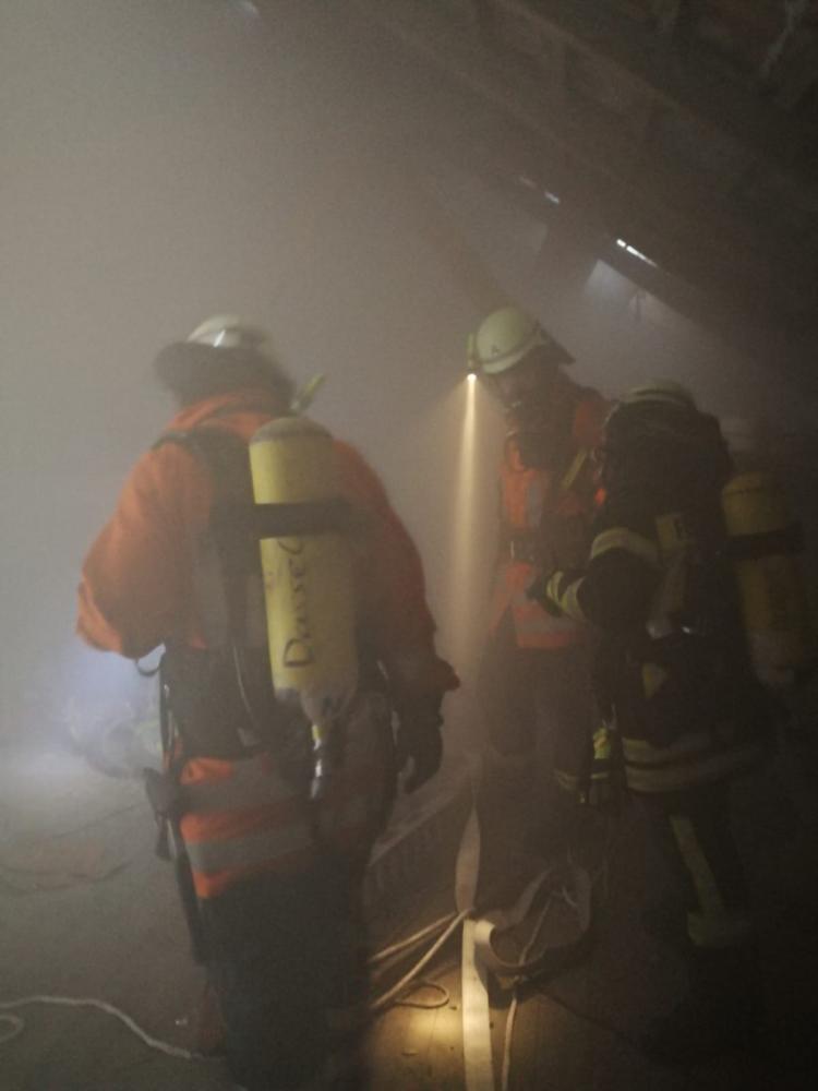 Unter schwerem Atemschutz drangen zwei Trupps in das verrauchte Obergeschoss vor und retteten die Verletztendarsteller. Ein Verletzter musste mit Hilfe der Steckleiter gerettet werden. Durch die Verrauchung wurde die Rettung extrem erschwert. Die Geretteten erhielten vor Ort eine Erstversorgung.