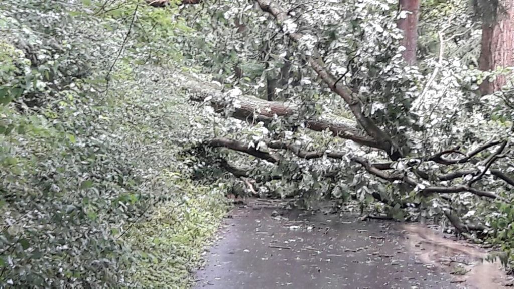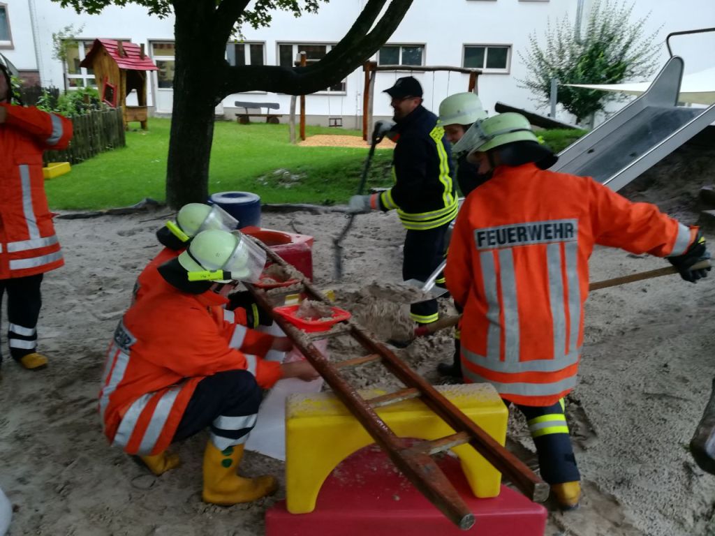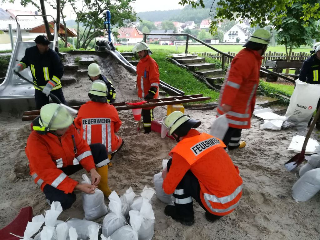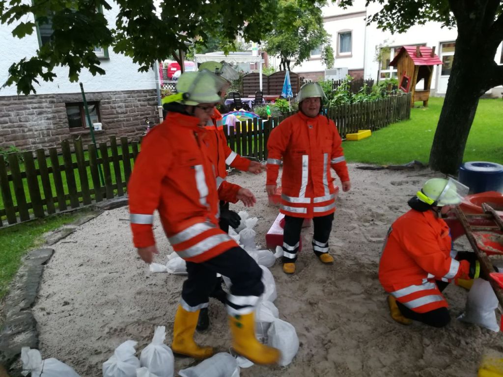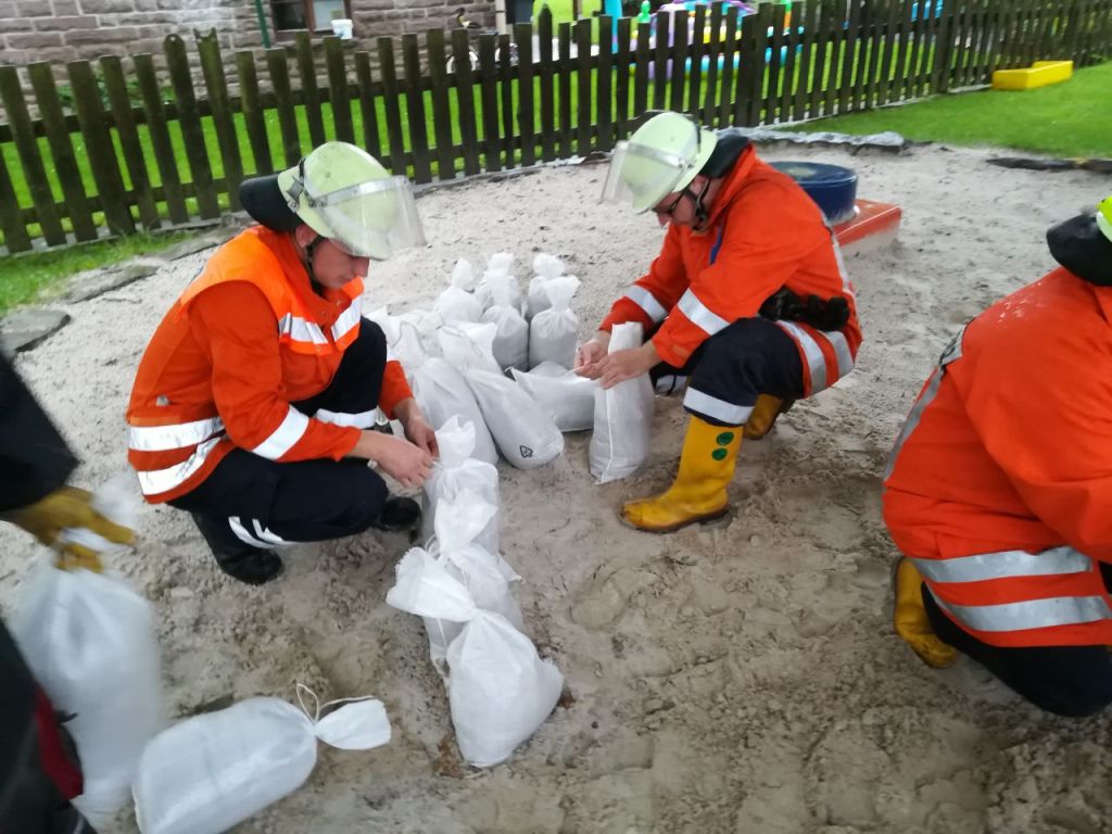 Gegen 19:00 Uhr begannen wir mit dem Abfüllen von Sandsäcken im Generationenpark und sicherten damit die Brinkstraße ab. Weitere Ausuferungen gab es im Bereich des Stubenangers, wo ebenfalls einige Sandsäcke aufgestapelt wurden. Auch Bäume hatten Probleme mit den aufgeweichten Böden und stürzten um.